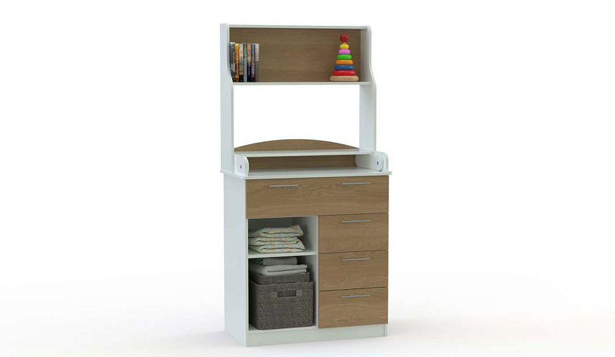 Комод пеленальный Магнолия 4 BMS оборудован надстройкой с открытыми полками, которые позволяют разместить под рукой средства гигиены, а когда малыш подрастет – игрушки и книги. В нижней части комода располагаются две ниши, один большой и три малых выдвижных ящика для хранения детских вещей. Пеленальную поверхность с откидным столиком защищают скругленные бортики. Купить комод пеленальный Магнолия 4 BMS вы сможете в нашем интернет-магазине, подобрав фурнитуру и цвет по каталогу.
