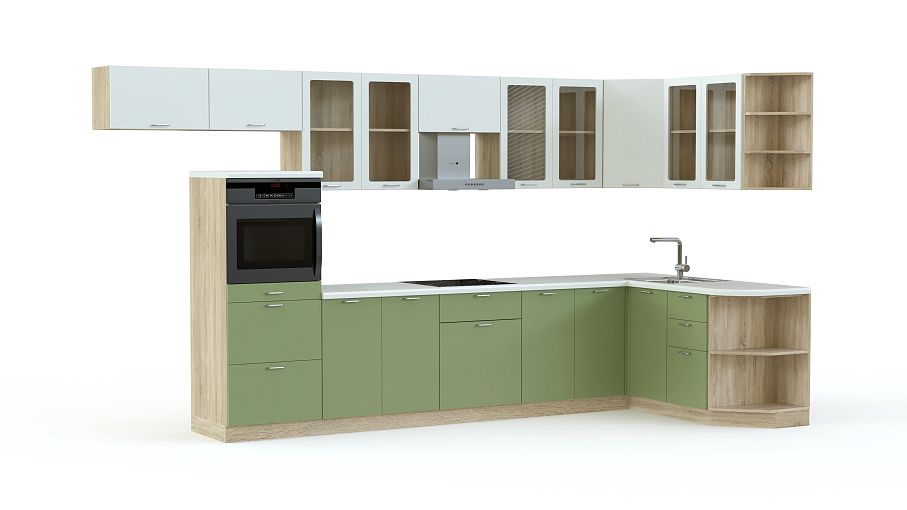 Кухня Киви-5 BMS поможет оборудовать просторную столовую в современном стиле. Угловая конструкция выгодно использует свободное пространство, а разнообразие входящих в комплект модулей позволит создать максимально комфортный интерьер и разместить все необходимое, от столовых приборов до бытовой техники. Лаконичная по форме, кухня смотрится эффектно и создает позитивное настроение благодаря гармоничному сочетанию свежих глянцевых оттенков навесных секций и матовых поверхностей под массив дерева нижней части. Купить кухню Киви-5 BMS, подобрав необходимые параметры, вы сможете в нашем интернет-магазине.