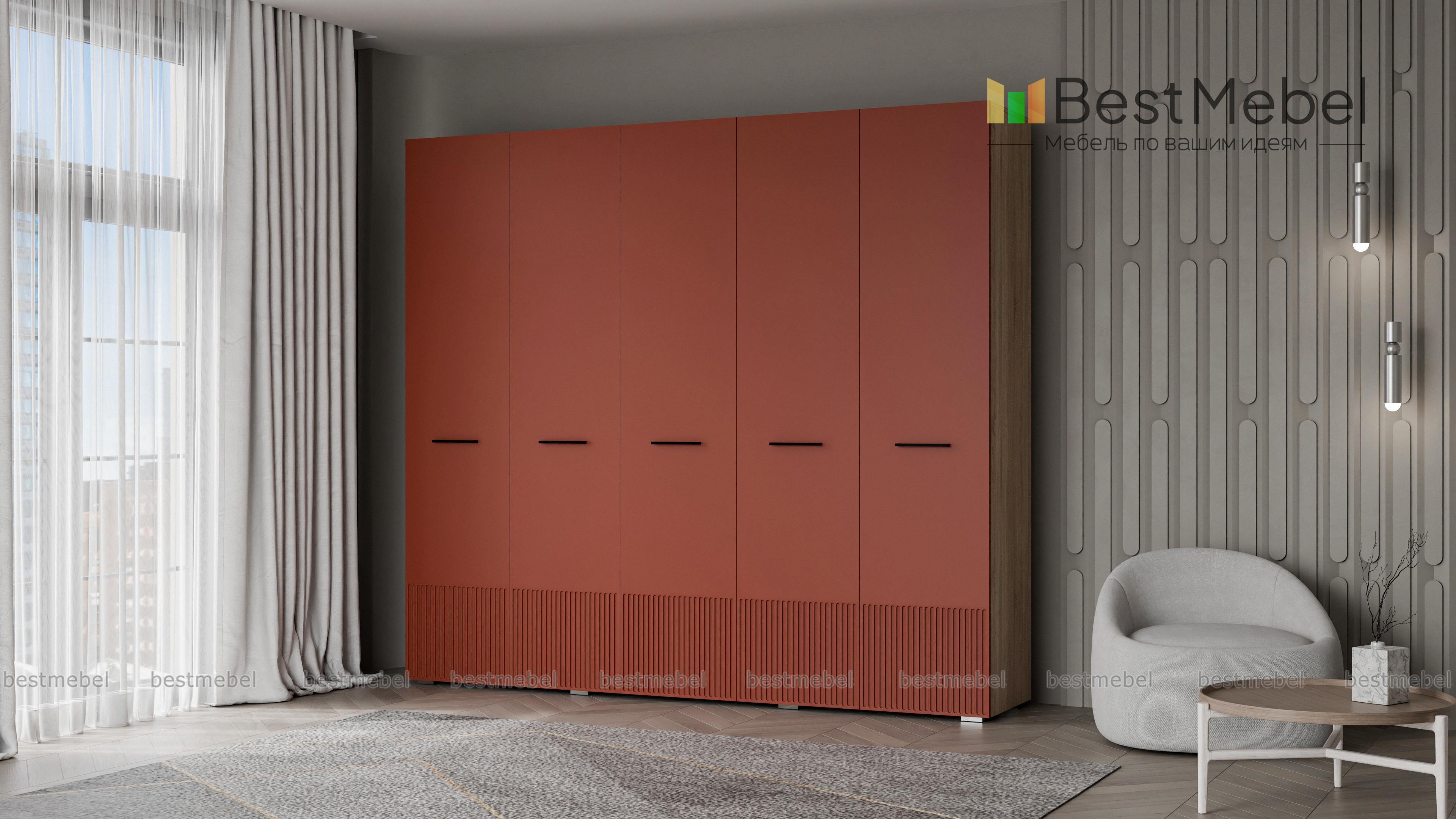 Шкаф распашной Декарт 5 BMS сочетает простую традиционную форму и актуальный дизайн. На сплошном светлом фасаде из МДФ выделяются поперечные ручки-скобы и фрезерованный рельеф, создавая визуально легкую конструкцию. Пятидверный гардероб позволяет организовать хранение с помощью пары штанг, вместительных верхних и бельевых полок. Купить шкаф распашной Декарт 5 BMS в удобном размере и любых оттенках из каталога вы сможете на сайте нашего интернет-магазина.