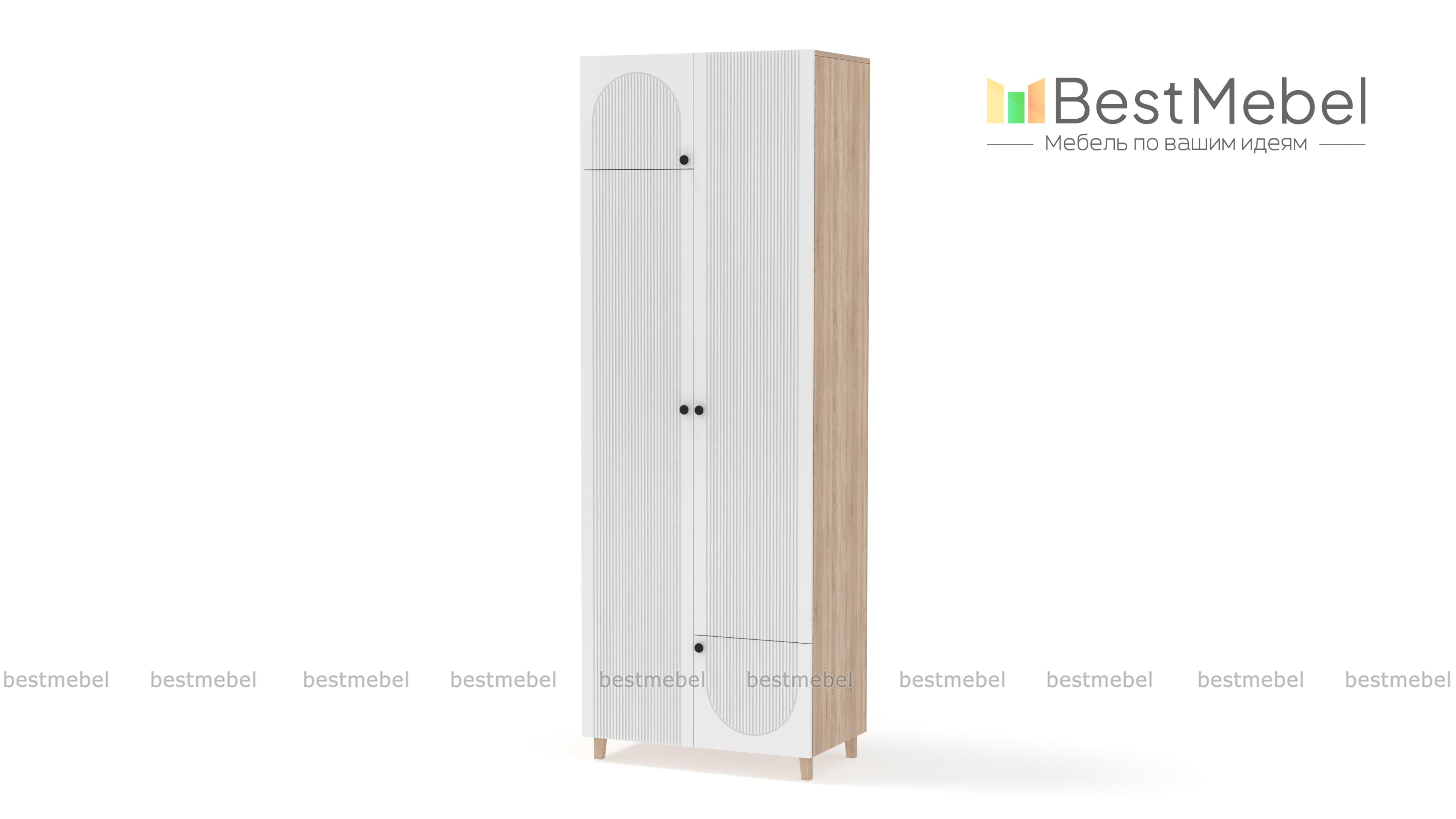 Шкаф распашной Рене 20 BMS компактен и прекрасно впишется в комнаты малого метража: спальни, детские и прихожие. Для более удобного хранения двухдверная модель оборудована дополнительными малыми распашными секциями — сверху и снизу. Прочный фасад из МДФ украшает акцентная фрезеровка, высокие ножки шкафа выполнены в оттенке светлого дерева Купить шкаф распашной Рене 20 BMS, изготовленный по индивидуальным размерам, приглашаем к нам в интернет-магазин.