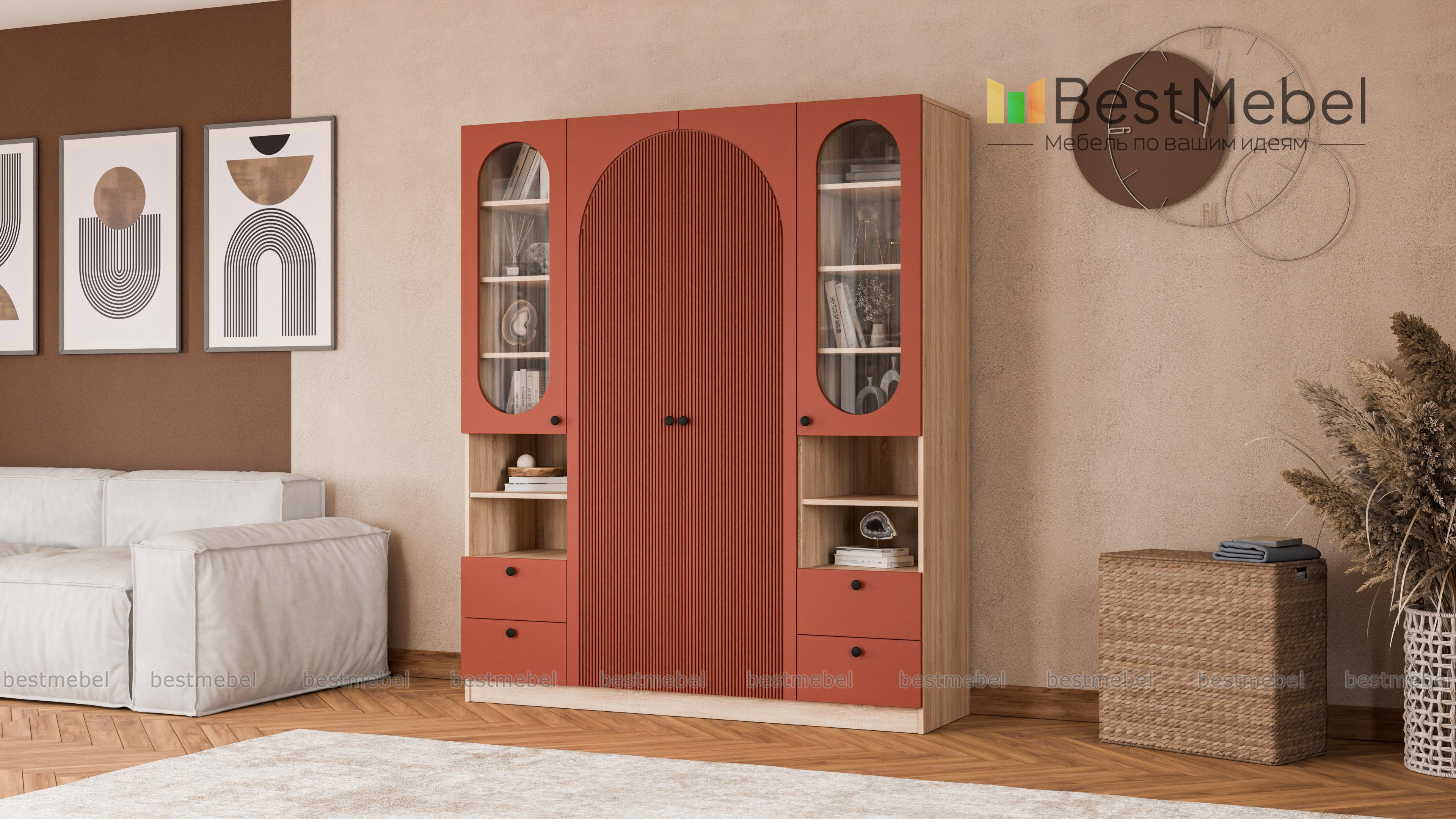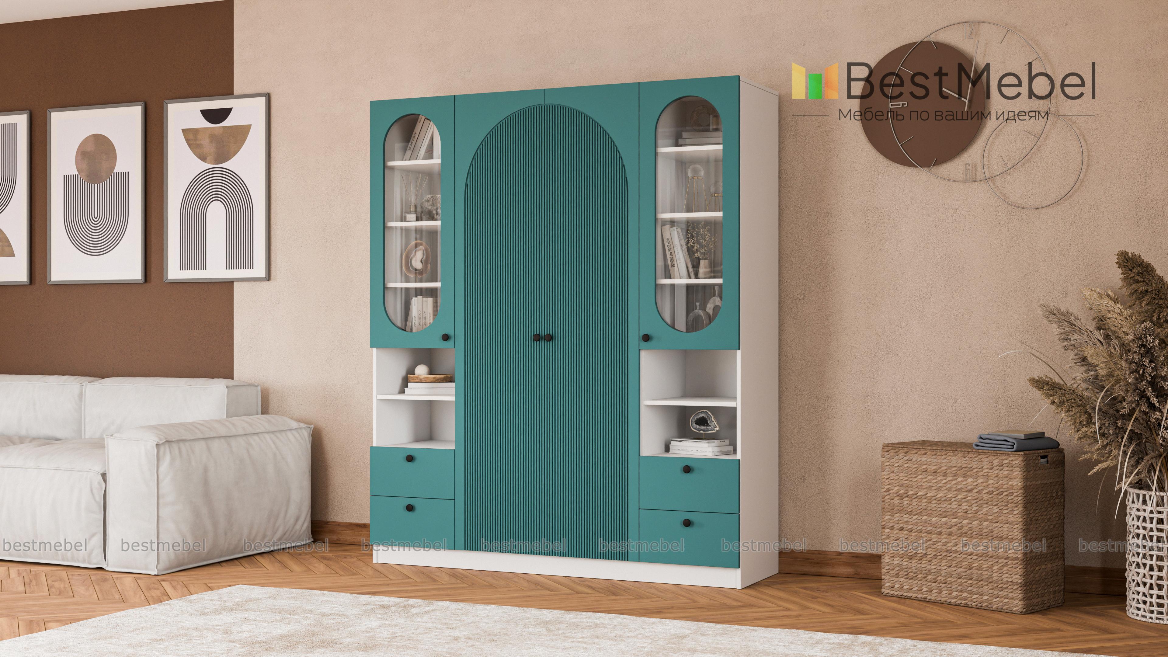 Шкаф распашной Вивьен 24 BMS дополнен двумя комбинированными секциями справа и слева. Система хранения с витринами, полками и ящиками позволяет разместить не только одежду и обувь, но и книги, интерьерные украшения, органайзеры с мелочами. Украшенный арочным вырезом, рельефом и овальными стеклянными вставками фасад выполнен в стильном темном оттенке из плиты МДФ. Купить шкаф распашной Вивьен 24 BMS вы сможете в нашем интернет-магазине с изготовлением по индивидуальным размерам.