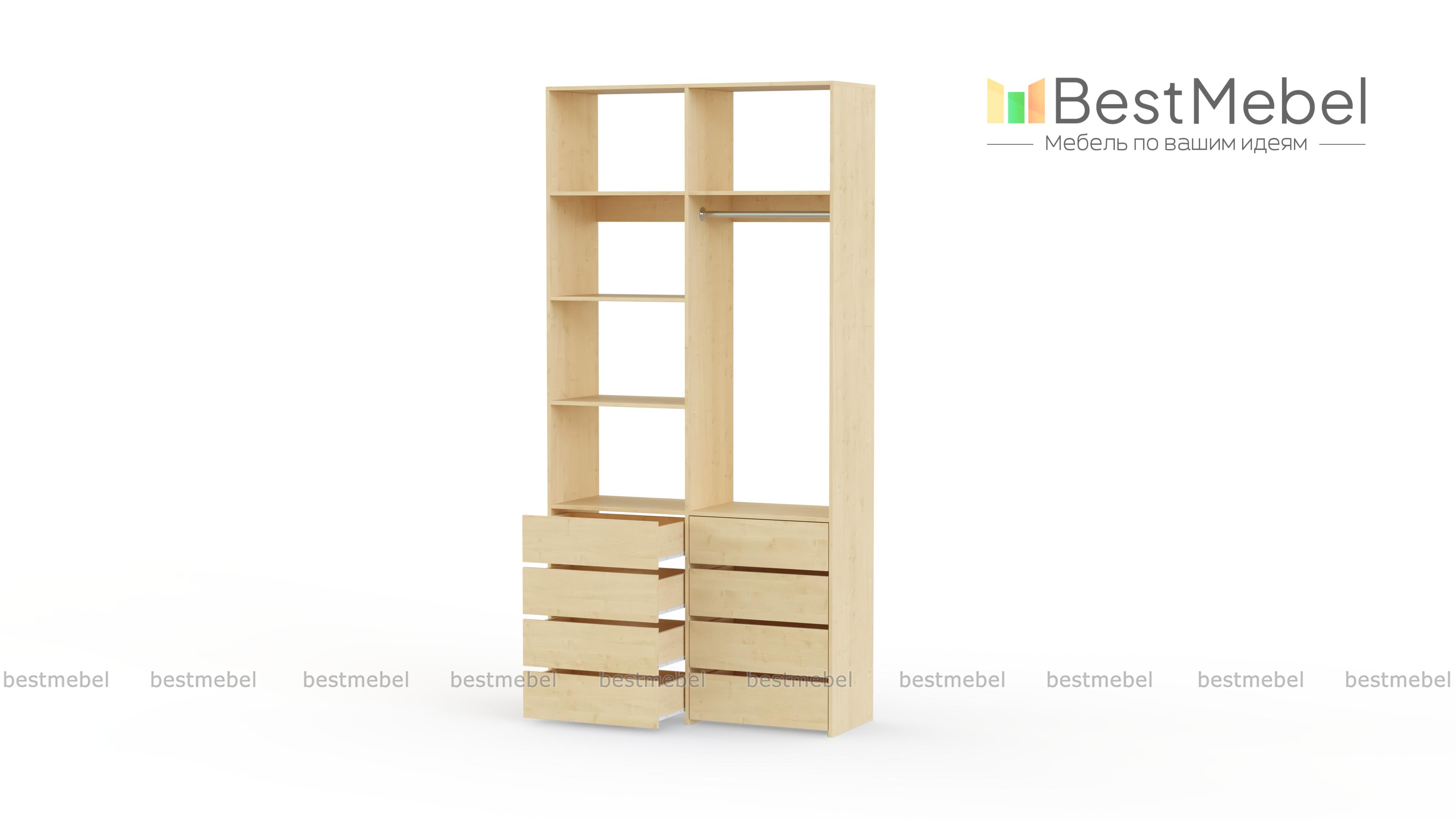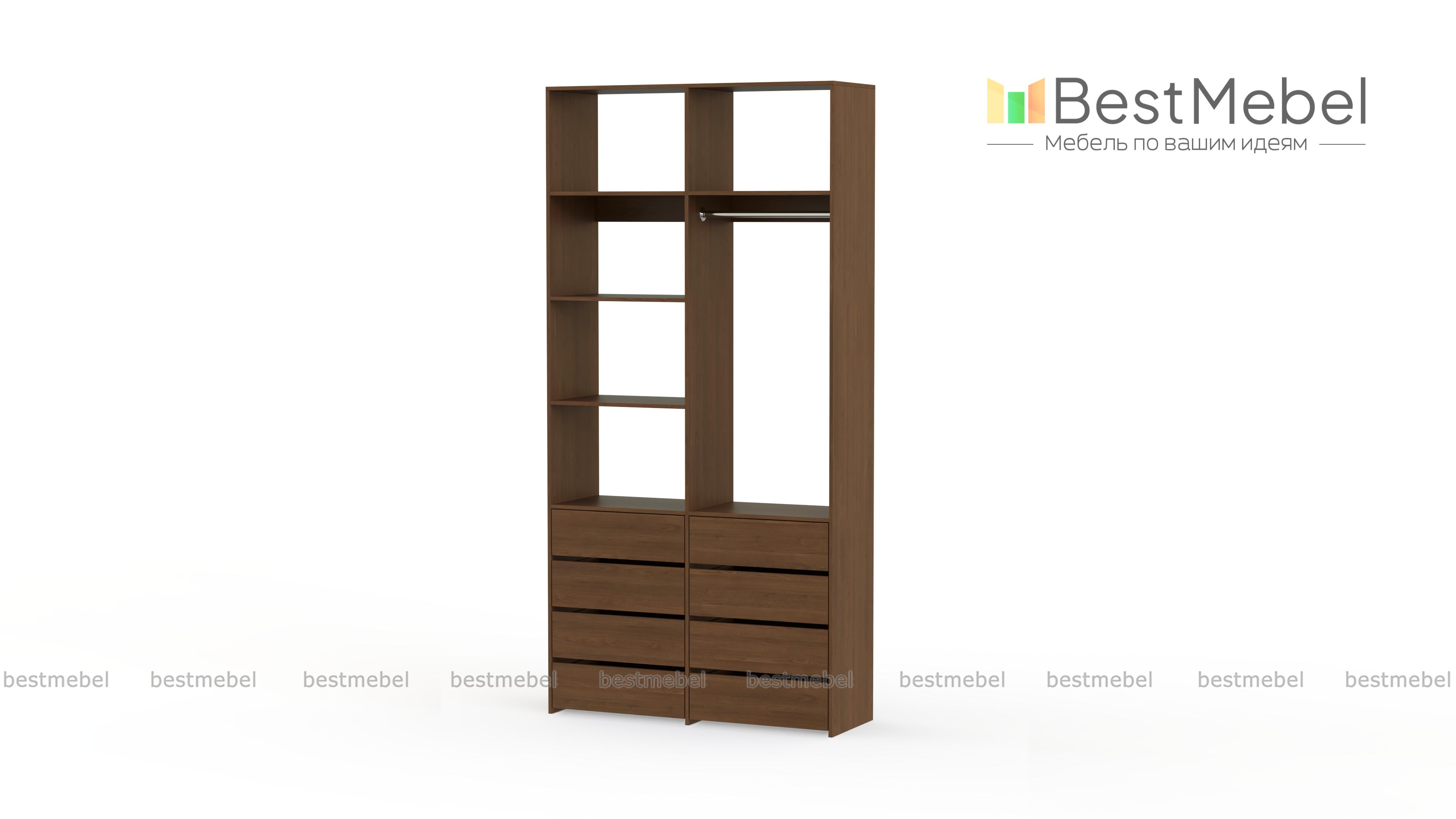 Стеллаж для одежды Мирта 3 BMS – функциональный и стильный предмет обстановки для вашего дома. Открытая конструкция позволяет разместить на виду повседневную одежду, коробки с обувью и органайзеры с мелочами, а для прочих вещей предусмотрены два ряда выдвижных ящиков. Прочность и долговечность стеллажу гарантируют материалы и фурнитура высокого качества. Купить стеллаж для одежды Мирта 3 BMS вы сможете в нашем интернет-магазине с изготовлением по индивидуальным размерам.