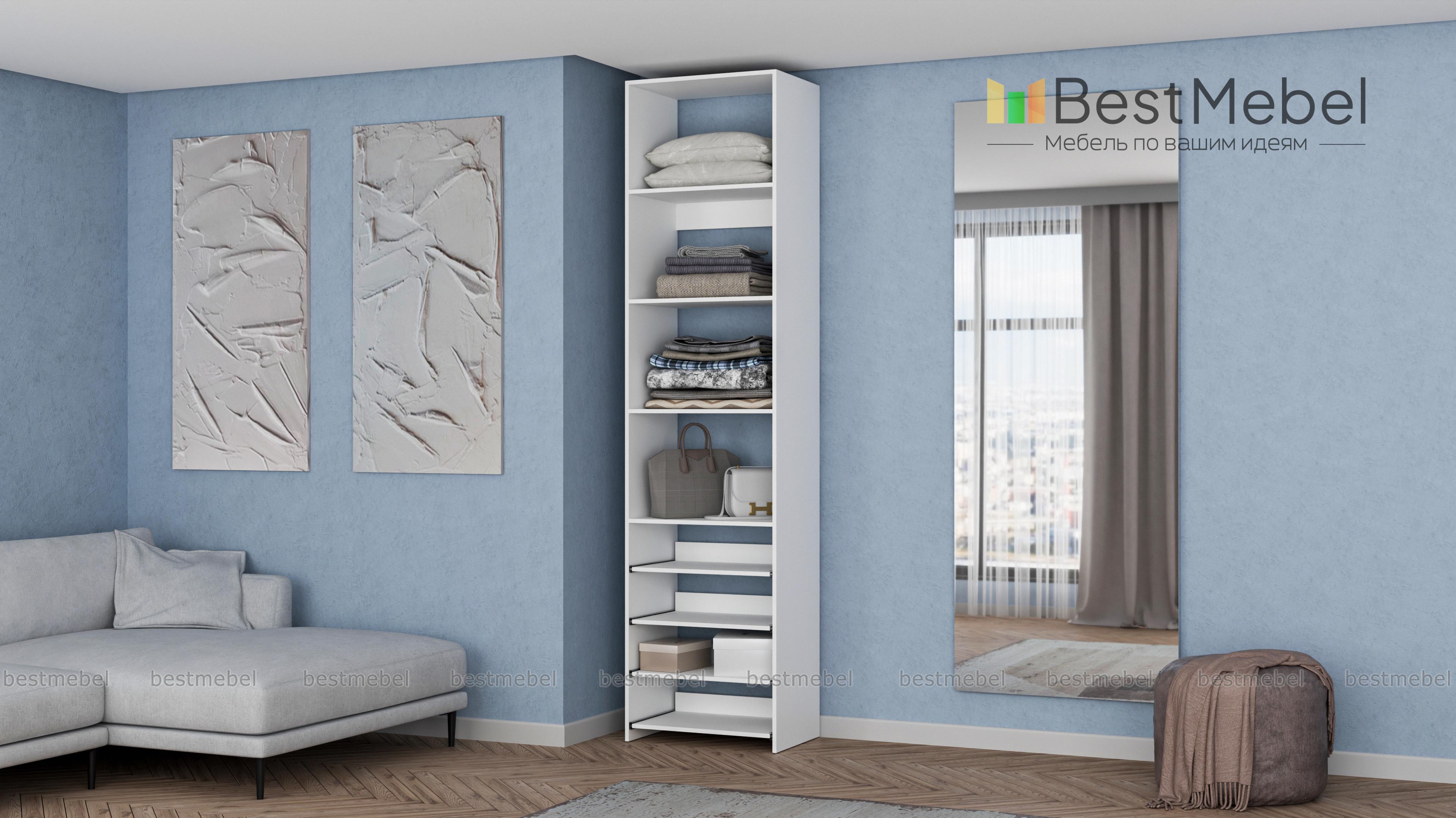 Стеллаж для одежды Мирта 74 BMS прекрасно подходит для небольшого количества вещей. В узком стеллаже, оснащенном четырьмя стандартными и четырьмя выдвижными полками можно хранить сложенную одежду, сезонную обувь и всевозможные аксессуары. Открытая конструкция обеспечивает удобный доступ к содержимому полок и упрощает уборку. Купить стеллаж для одежды Мирта 74 BMS, изготовленный по индивидуальным размерам, можно недорого на сайте нашего интернет-магазина.