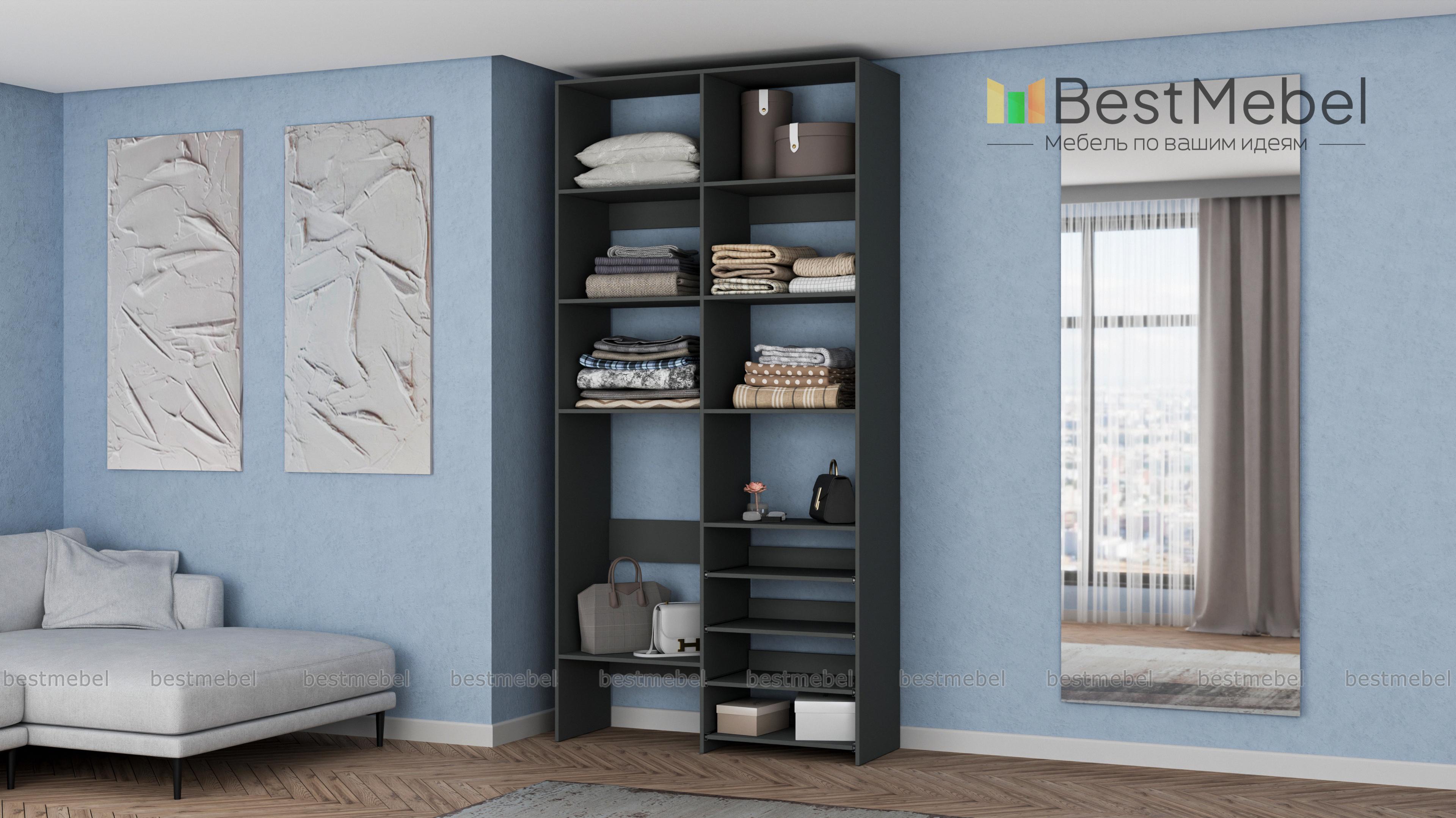 Стеллаж для одежды Мирта 80 BMS подойдет для комнат малого метража, где важна компактность. Модификация с открытыми секциями разных размеров и полками на направляющих оптимальна, если нужно хранить сложенную одежду, обувь, коробки и корзины с вещами. Базовый природный оттенок стеллажа и простая форма отлично смотрятся в любом современном интерьере. Купить стеллаж для одежды Мирта 80 BMS в необходимом размере и цвете вы сможете на сайте нашего интернет-магазина.