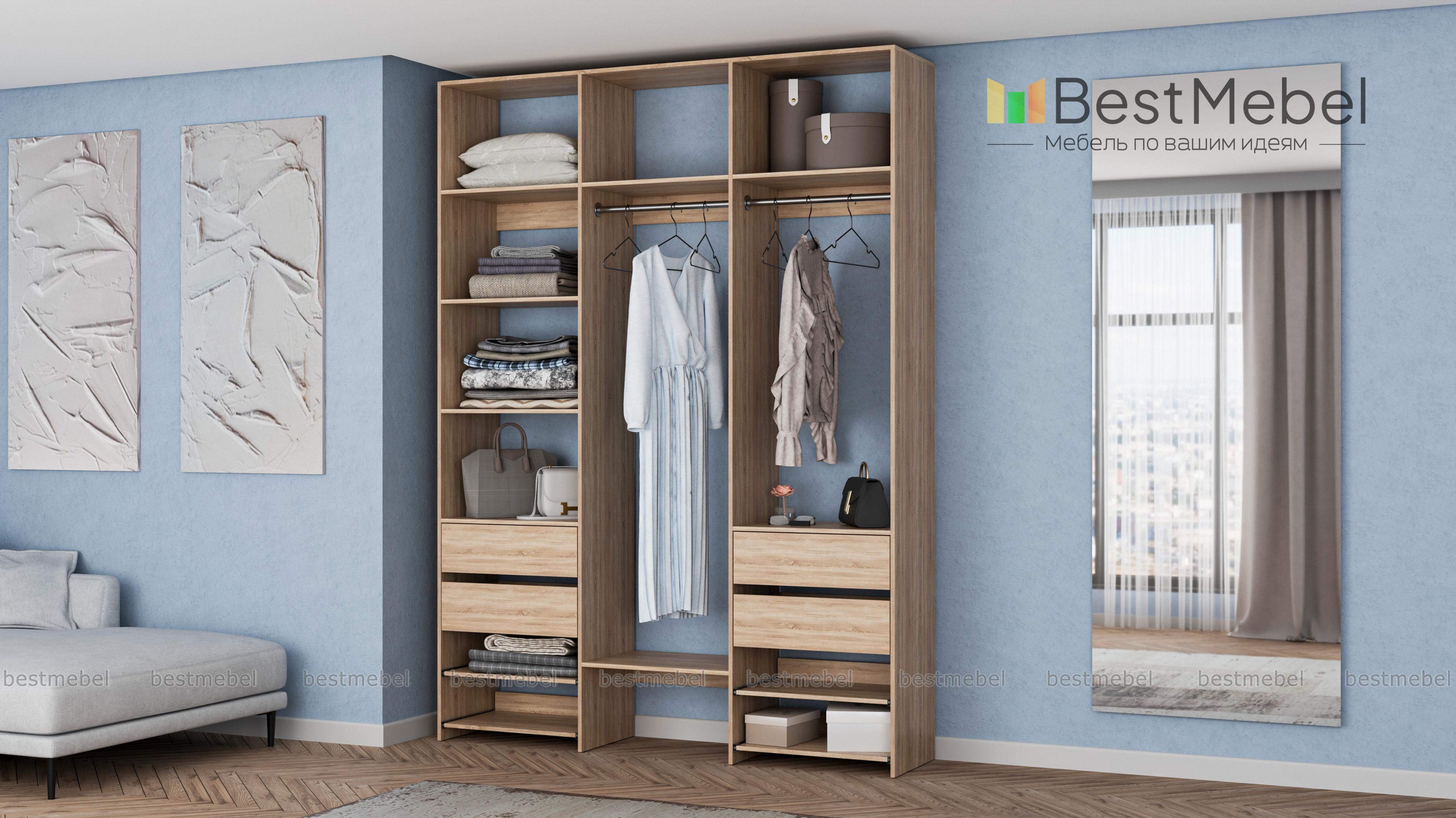 Стеллаж для одежды Мирта 90 BMS станет вашим помощником в сохранении порядка. Компоновка, включающая две штанги, боковые и верхние полки, две пары ящиков и выдвижных панелей, оптимальна для аккуратного размещения одежды на вешалках и в сложенном виде, обуви и мелких аксессуаров. Нейтральный древесный оттенок ламинированной плиты подчеркивает универсальность дизайна. Купить стеллаж для одежды Мирта 90 BMS в прихожую, гардеробную, мастерскую приглашаем в наш интернет-магазин.