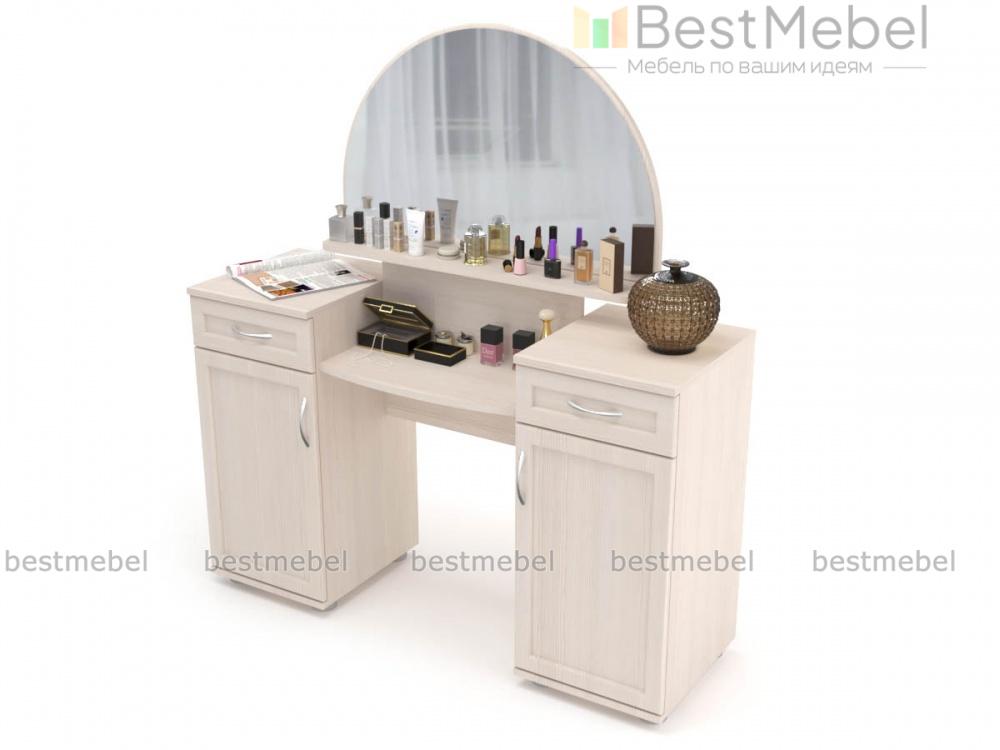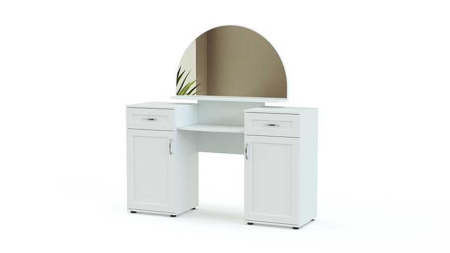 В этой модели элегантность стиля модерн сочетается с функциональностью современной вещи. Полукруглое зеркало, на полке которого будут оригинально смотреться парфюмерные флаконы, гармонирует со скругленной полочкой – столешницей. По бокам расположены вместительные тумбы с распашными дверцами и выдвижными ящиками для косметики и украшений. Фасады просто декорированы, фурнитура неброская и стильная. Приобрести туалетный столик Ника-Люкс BMS в подходящем цвете вы сможете у нас в интернет – магазине.