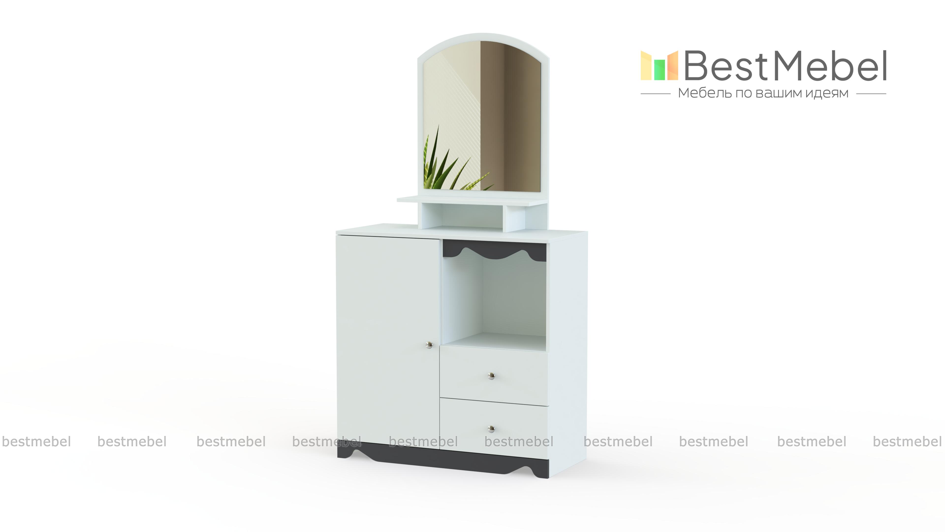 Очаровательное трюмо для детской комнаты. Маленькую хозяйку непременно порадует симпатичное зеркало и наличие большого количества разнообразных полочек и ящичков, в которых будет удобно хранить косметику, украшения, аксессуары для волос и множество других сокровищ. Нежно – белый декор туалетного столика Пинк-6 BMS тоже не оставит настоящую барышню равнодушной. Выполняется модель в светлых натуральных тонах из прочных безопасных материалов и отлично дополнит интерьер детской.