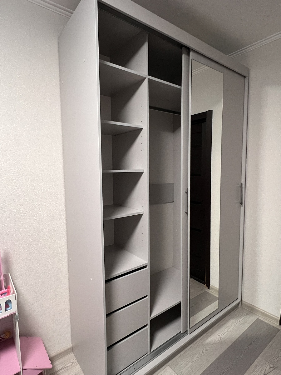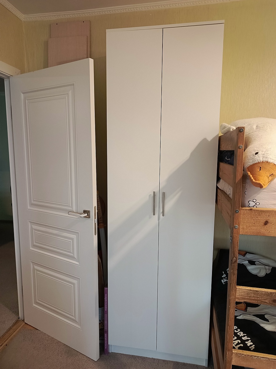 Заказ 00000858508Шкаф муж собрал сам, достаточно быстро ))Мы заказали в белом цвете, увеличили ширину и немного убрали глубину. Ещё добавили одну полочку, чтоб больше всего уместилось )Влезло пол детской в этот шкаф, я очень довольна )