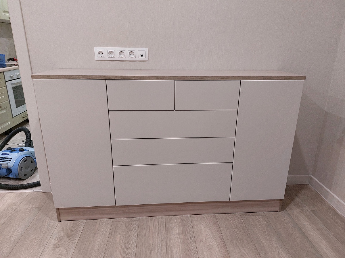 Если вы берёте не дешёвые роликовые направляющие, а приличные шариковые - получится качественный комод. Красивые рамочные фасады, уникальные ручки и грамотно продуманная система хранения. На фото корпус ясень шимо светлый, вставки дуб крафт белый. Кстати не рекомендую брать рамки фасадов в цвет корпуса (как на фото) - дизайн недостаточно "играет". Но по качеству будьте готовы к рекламациям, которые, на моём опыте, достаточно быстро удовлетворяются досылкой нужных деталей. Ну и например только сейчас на финальном фото заметил, что правые ручки ящиков на среднем уровне перекошены (т.е. придётся немного пересверлить заводские отверстия).