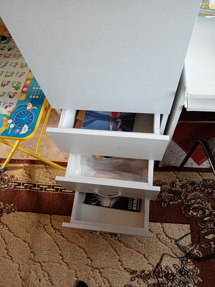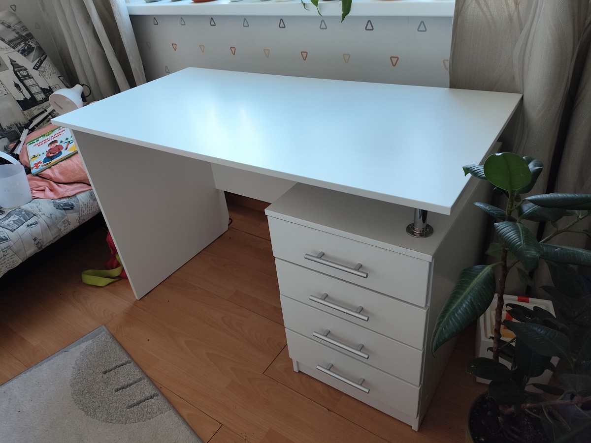 Заказала стол ребенку (Заказ 00000803561). Нужно было, чтоб было много ящиков закрытых. Поэтому выбор пал на данный стол. Понравилось то, что можно было его поменять и доработать под себя. Поменяли фурнитуру на более качественную, увеличили высоту, добавили полку под монитор. Цена, конечно, при этом увеличилась, но и стол получился фактически по  индивидуальному проекту.  Муж забирал сам, собирал тоже сам. Нам все понравилось (все наши пожелания были учтены, ничего не забыто). Будем заказывать еще себе стенку.