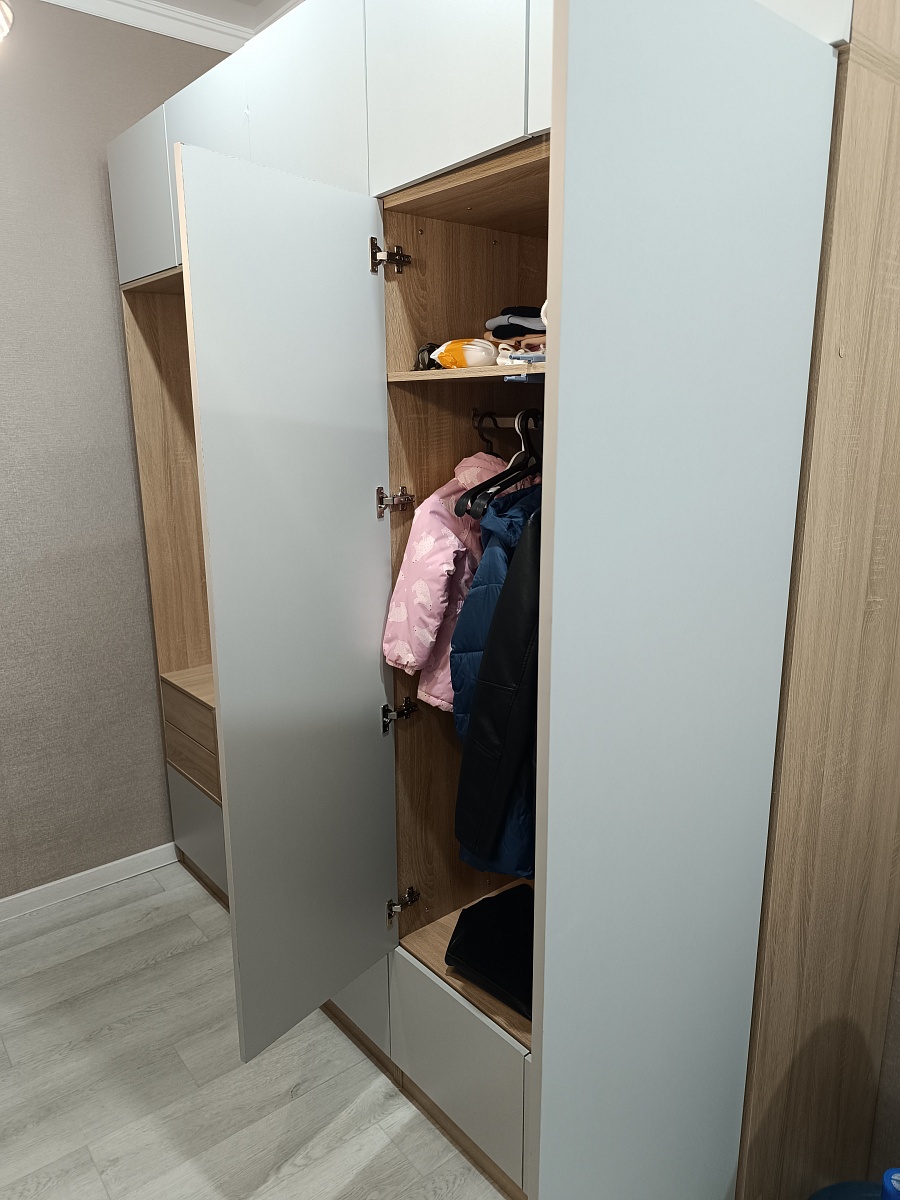 Заказ 00000813351, изделие ЭСКИЗ №00000813351 Шкаф распашной Остин Лайт 6 BMS (1500х2500х600)Шкаф заказывался по индивидуальным размерам и дополнительными опциями в виде петель с доводчиками и ручками на выбор. Заказ делал в шоуруме на метро Домодедовская. Шкаф привезли буквально через несколько дней, собирал сам с товарищем. Ушел на сборку 1 день. Качеством изготовления очень доволен. Рекомендую данную модель и продавца.