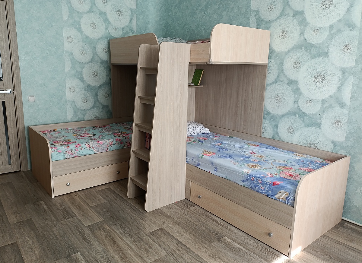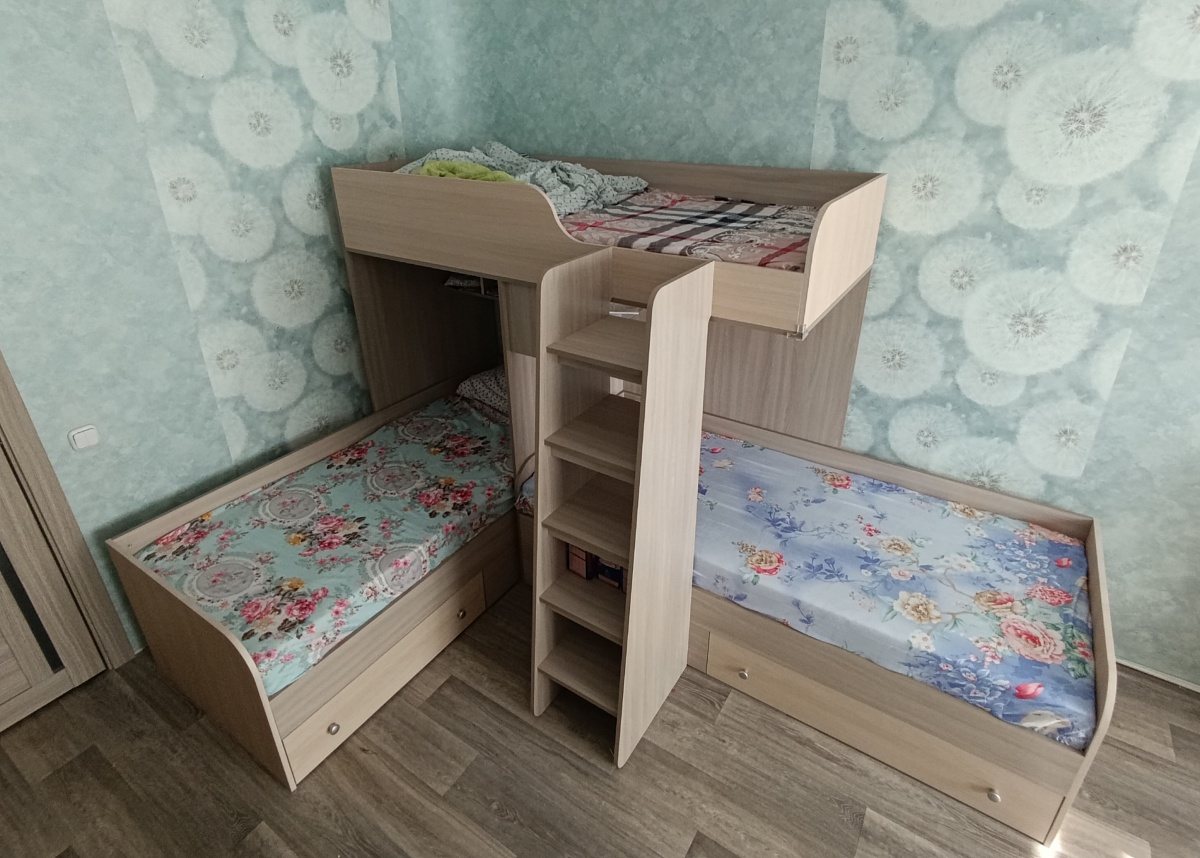 У нас в одной комнате растут трое мальчиков. Эта кровать оказалась единственным удобным вариантом, как разместить три "взрослых" спальных места, чтобы при этом осталось место для игр и учебы.Действительно быстрое и качественное изготовление, бесплатная доставка, да еще и бонусом получили бесплатную полочку, отлично вписавшуюся в интерьер.Спасибо конструкторам и производителям!