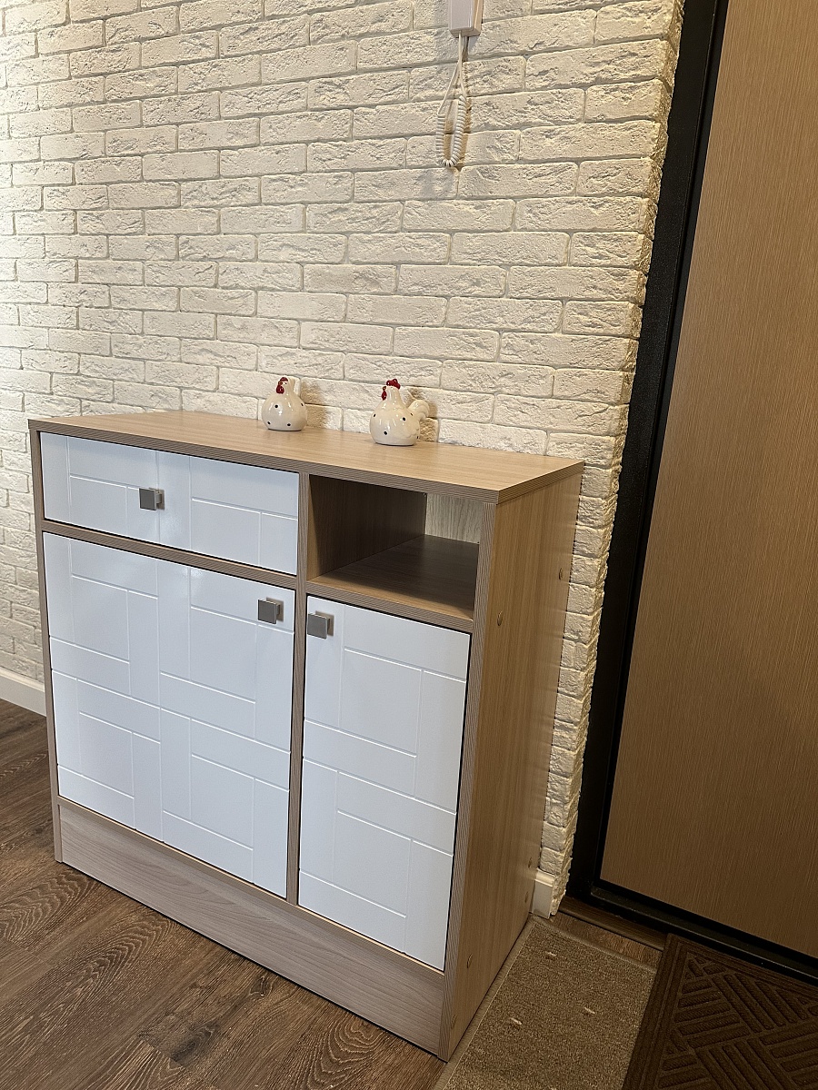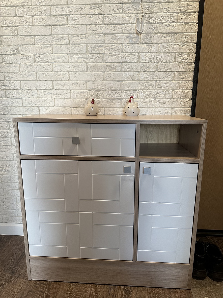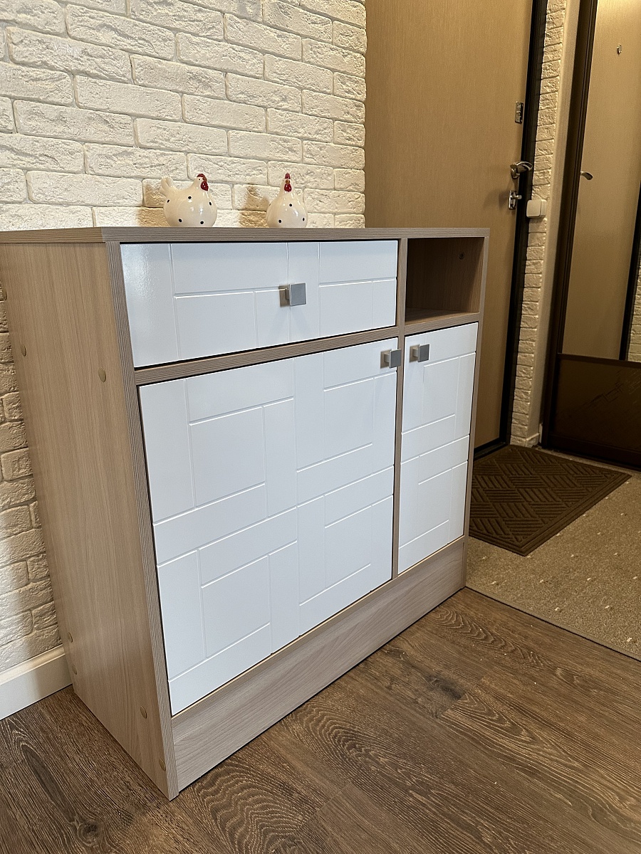 Заказывала тумбу Остен в прихожую (Заказ 00000710797). Очень удобно, что можно выбрать все по своим желаниям (цвет, размер, фурнитуру и т.д.). Учитываются все пожелания: я попросила сделать тумбу без верхних ограничителей на поверхности, корпус в цвете Ясень Шимо Светлый, фасад Белый глянец. Сборка по инструкции не вызывала проблем. Получилось очень здорово! Спасибо магазину. Заказываю уже много лет тут мебель.