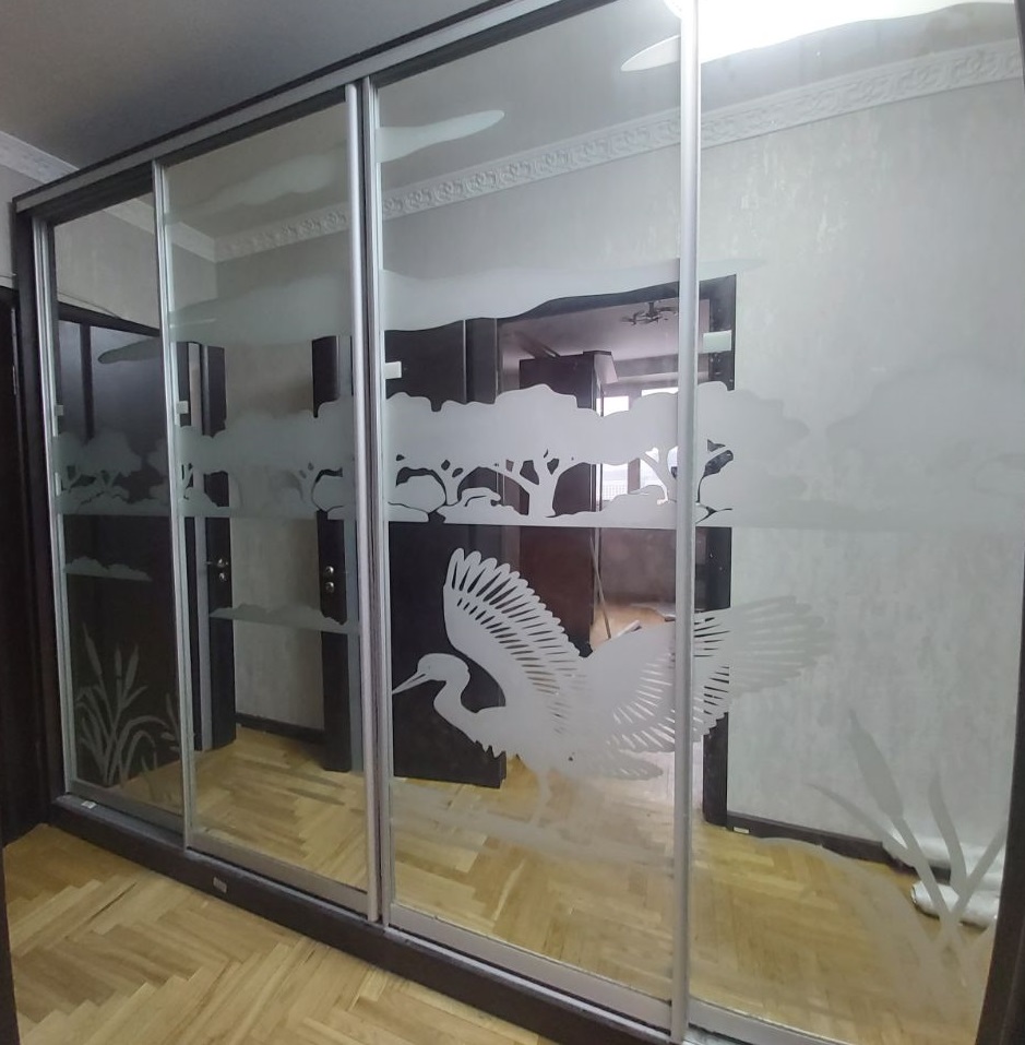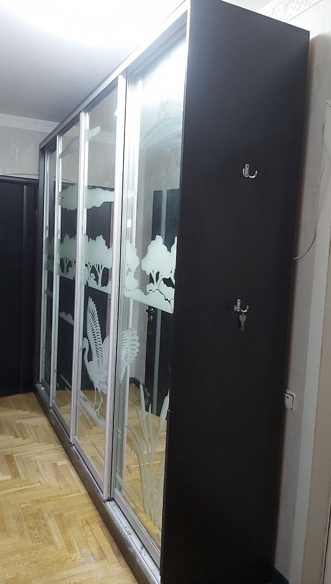 Заказ в личном кабинете №180208. Прекрасный шкаф-купе, благодаря возможности делать по своим размерам, смогли вписать в узкое пространство между стеной и дверью. Огромный выбор пескоструйных рисунков на зеркала.