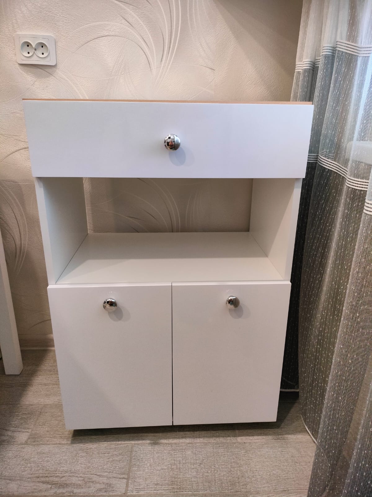 Шкафчик сделали по индивидуальным размерам, предложили всё летали сделать влагостойкими, так как планировался шкаф в ванную, выбрала белый шагрень, смотрится отлично, доводчики работают хорошо, полка открывается и зависает в таком положении, пока не закроешь. Собирался шкафчик легко. Не первый раз пользуюсь конструктором в этом магазине, и всегда была довольна. Спасибо всём сотрудникам!