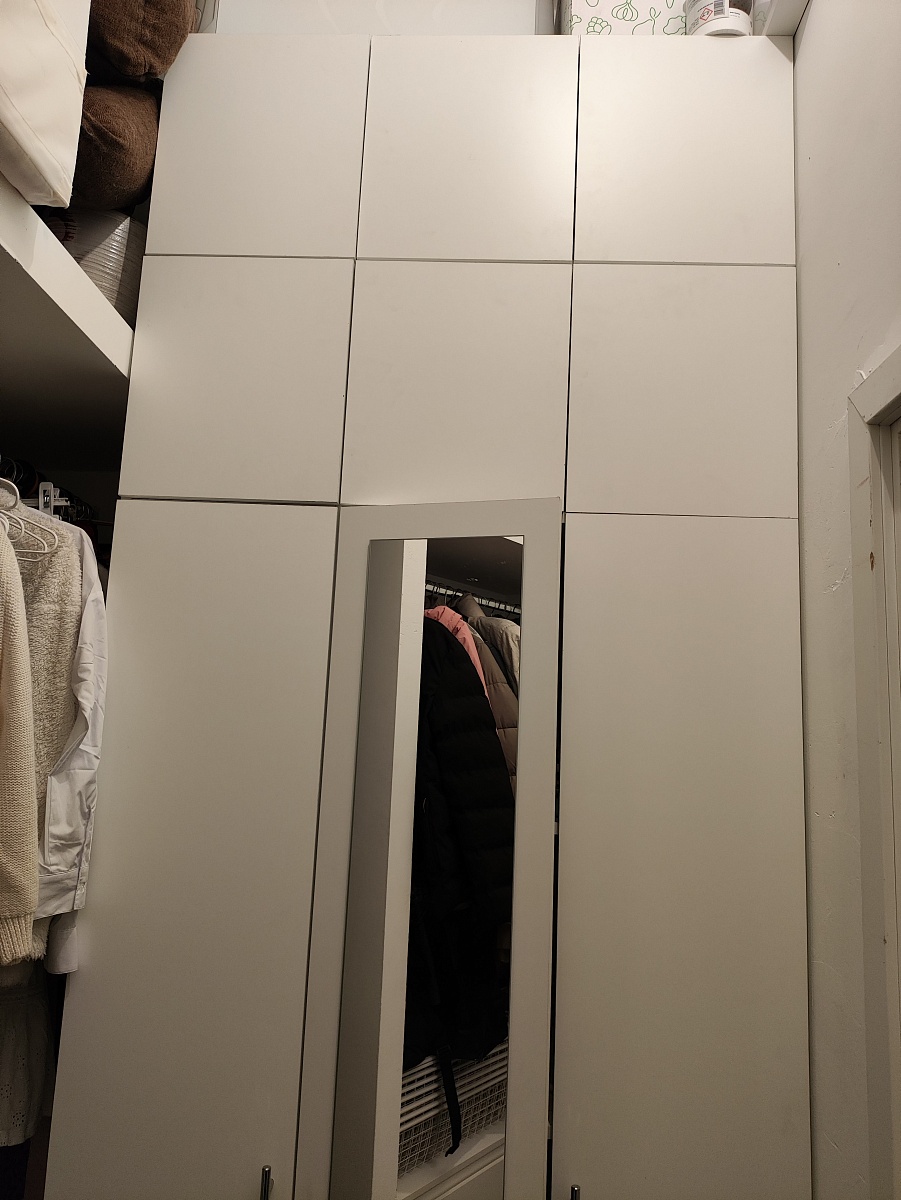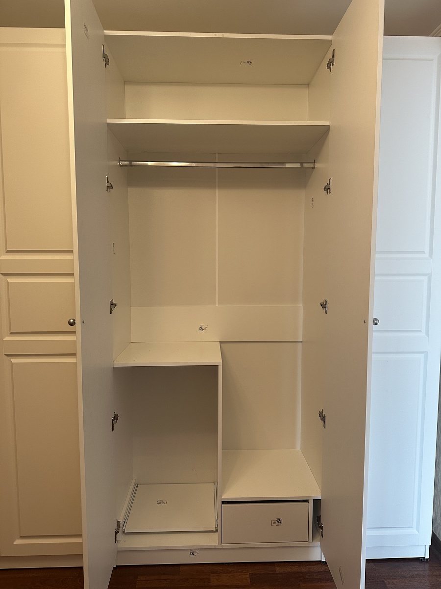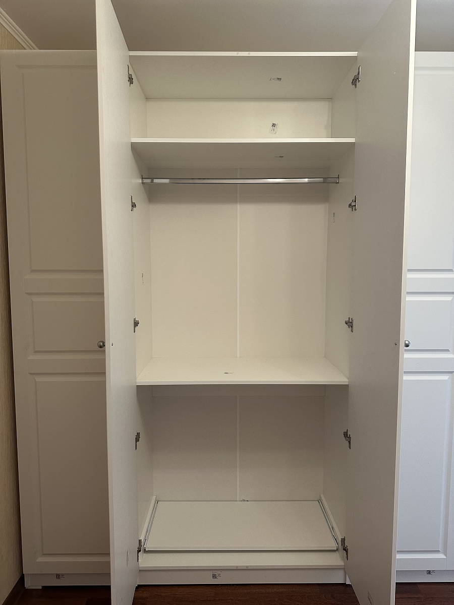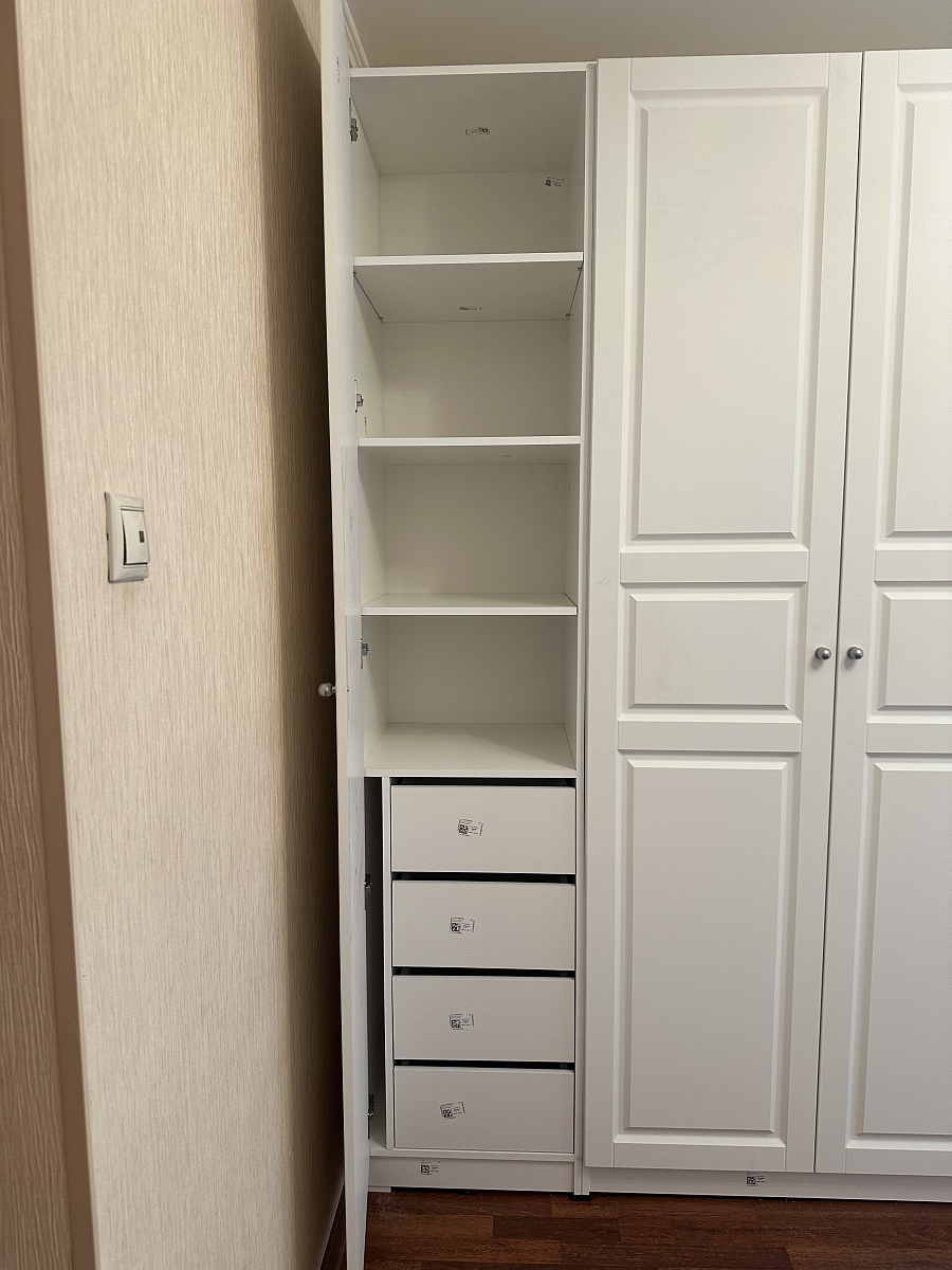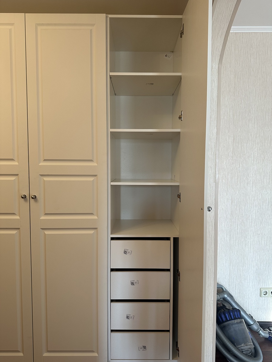 Шкаф порадовал, смотрится солидно. Есть возможность по своему усмотрению изменить конфигурацию: добавили зеркало и дополнительные полки, изменили ручки, изменили размеры. Думали будут проблемы из-за сборки в стеснённых условиях, но мастер за 3 часа все собрал на отлично. Заказ 00000133736
