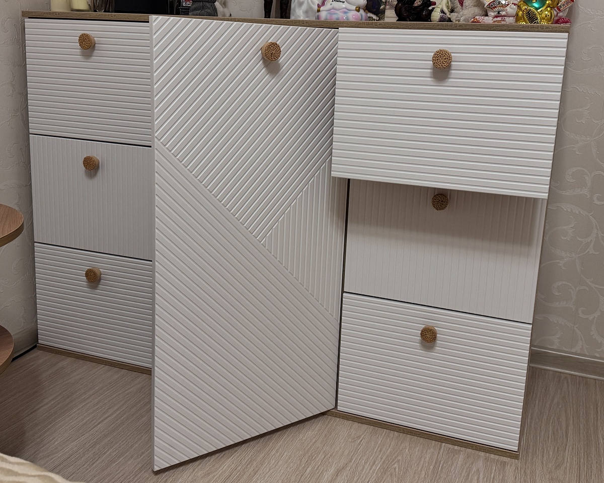 Номер заказа 1129867.Больше года искала себе комод с адекватным соотношением цена/качество. И, наверное, ещё бы долго искала, если бы подруга не посоветовала мне BestMebelShop, в котором они покупали большое количество мебели в новую квартиру.Что я могу сказать? Мои ожидания оправдались на все 100, очень довольна качеством комода, но больше всего понравилась возможность сделать заказ под индивидуальные размеры, а также самой выбрать цвет корпуса и фасадов.От сборки отказалась, сами собирали, это оказалось совсем даже не сложно, вдвоем справились! В комплекте к комоду были ножки, но их не стали устанавливать, потому что кот будет все свои игрушки под него таскать, а нам потом ползать и доставать. Комод очень аккуратный, красивый, потрясающе вписался в цветовое решение комнаты. Единственное, что запах не ушел пока, который чувствуется при открытии ящиков, но это у любой новой мебели такое.